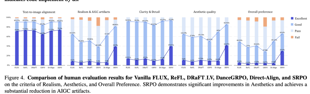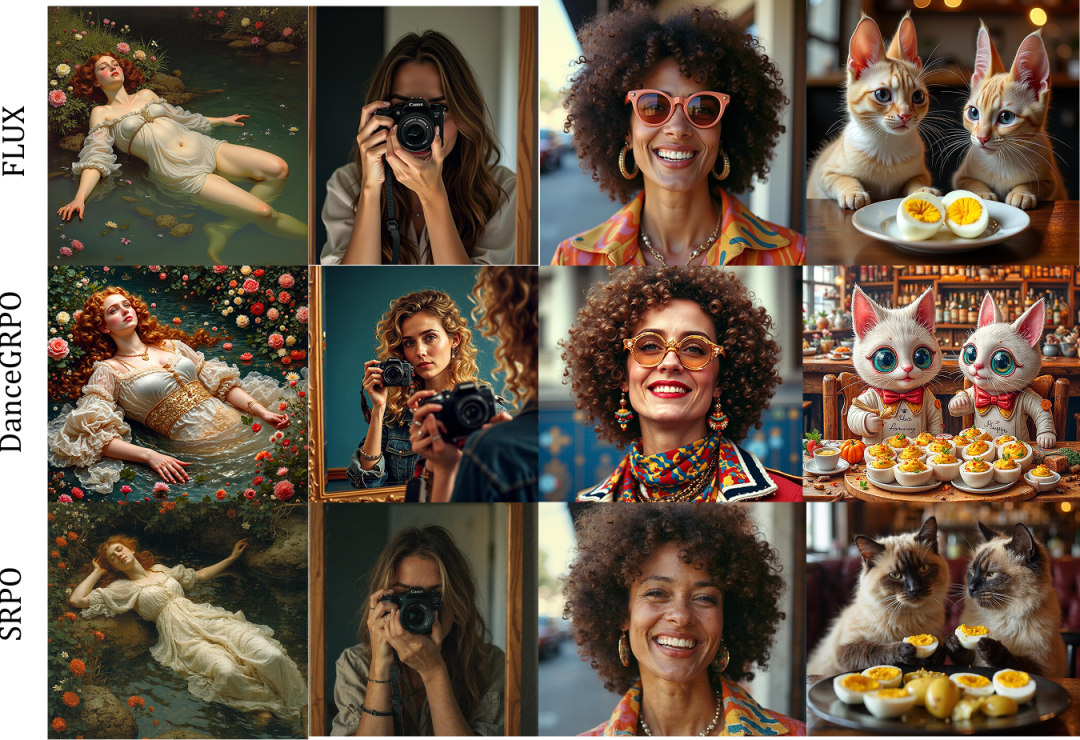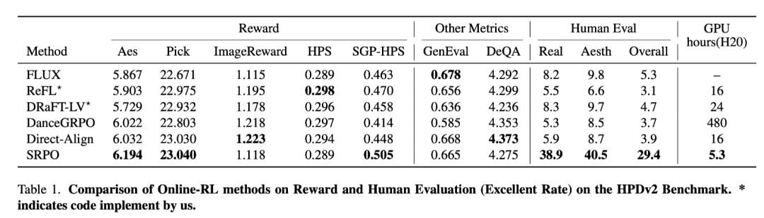 SRPO 定量指标达 SOTA 水平,人类评估的真实度和美学优秀率提升超过 3 倍,训练时间相比 DanceGRPO 降低 75 倍。