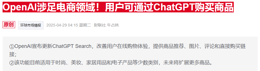 近几个月来,OpenAI一直布局电商领域。4月时,公司在网络搜索工具ChatGPT Search中引入商品推荐功能,用户可以通过ChatGPT提供的链接购买商品。