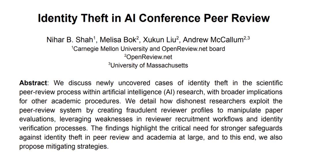 近日,OpenReview 团队与多所高校学者近期发布的一份 6 页报告披露:在 2024 年 2–4 月及 2025 年 4 月,对多场人工智能(AI)学术会议的调查中,他们识别出 94 个使用他人身份注册的评审/元评审账号 ,作案者利用评审招募、身份校验与分配流程中的薄弱环节,试图为自己(真身份)撰写或换取有利评审意见。