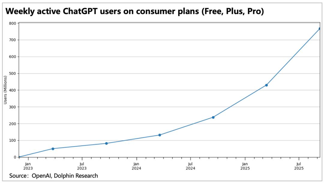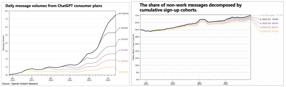 当然,OpenAI能够产生影响的关键,在于其目前巨量的用户规模和交互粘性。目前周均7亿的用户,每日交互量数倍增长,其中非工作相关的交互量从去年7月的56%上升到72%。越晚注册(1Q25)的用户,交互频率越高,且越与工作无关。这里体现到ChatGPT的破圈效应,已经从工作流的核心用户,拓展到普通用户圈层。