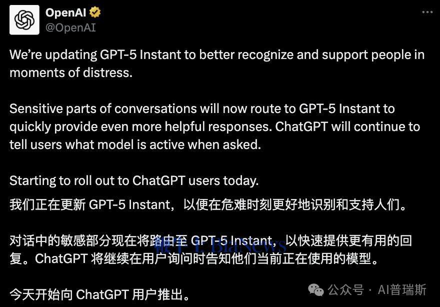 OpenAI在宣布,将更新 GPT-5 Instant 以“更好地识别并支持用户在情绪困扰时的状态”。这项更新让系统能在检测到“敏感对话”时自动切换到 GPT-5 Instant 模型,以提供“更快速、更有帮助”的回应。官方称,更新正陆续推送至 ChatGPT 用户。