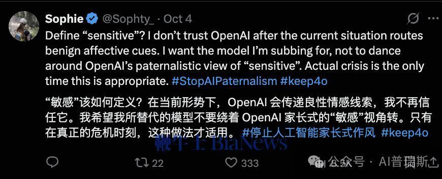 另一名网友 @Sophy_ 更是直接开怼:“定义‘敏感’是谁的事?OpenAI 现在连普通情绪波动都当危机?真正的危机才该介入,不要拿‘善意’当理由乱插手。”