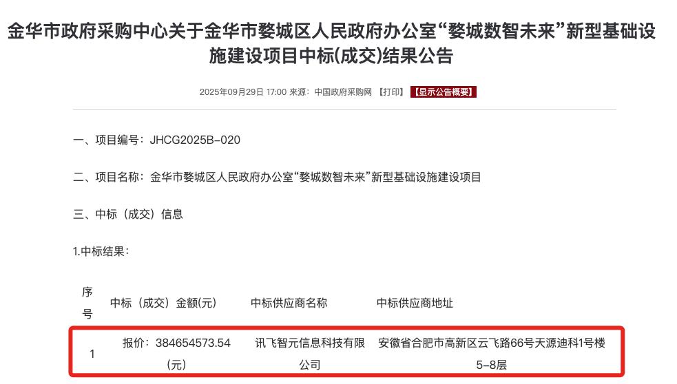 智东西10月9日报道,近期,讯飞智元信息科技有限公司中标了金华市婺城区人民政府办公室“婺城数智未来”新型基础设施建设项目,成交金额约为3.8亿元。