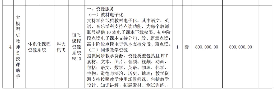 以AI+教育为例,该方案引入了大模型AI教师备授课助手,采用科大讯飞的讯飞课程资源系统V5.0,包括教材电子化、同步教学资源等资源服务,报价80万元。