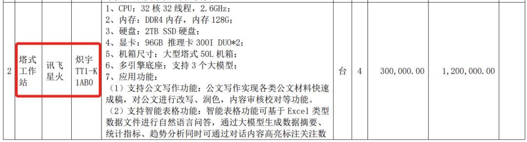 同时,该中心采用4台讯飞星火塔式工作站,搭载炽宇TT1-K 1AB0,合计报价约120万元。
