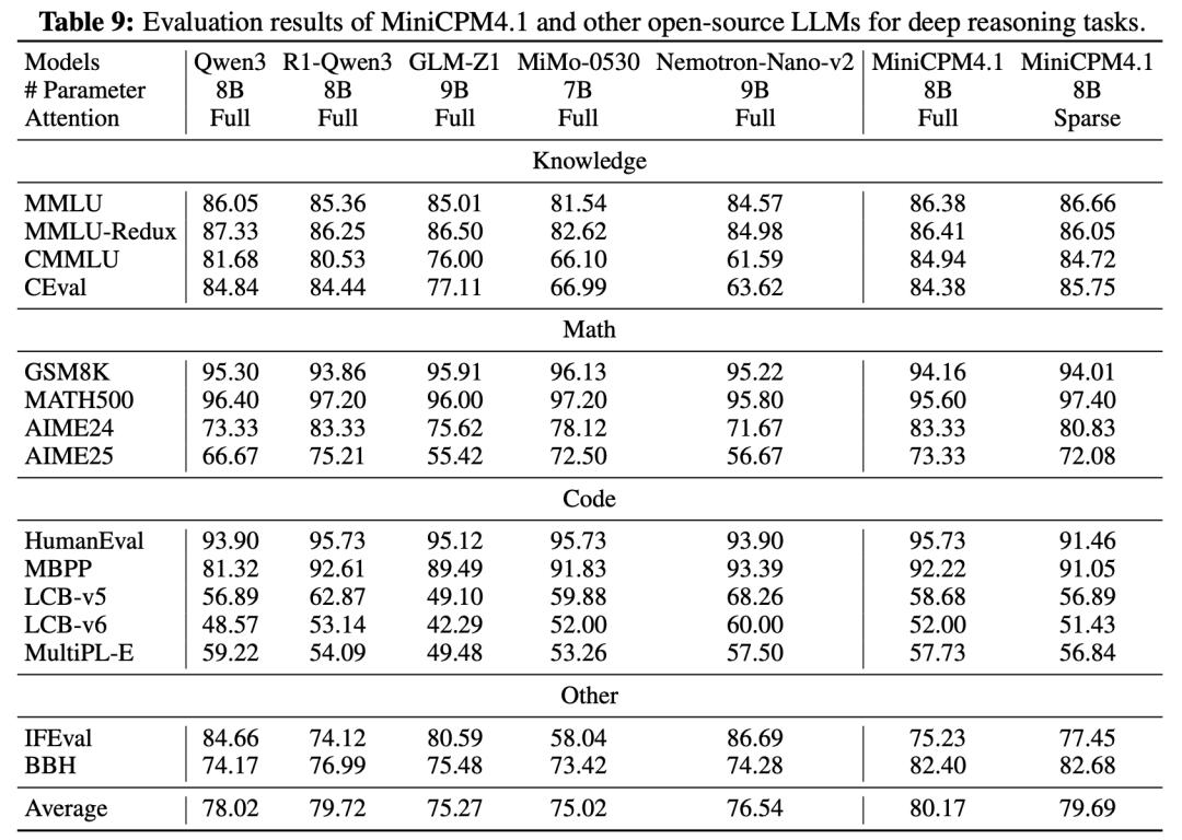 MiniCPM4.1充分利用稀疏注意力、投机采样等高效算法,在LiveCodeBench、AIME等代码、数学推理的测试中,推理速度比Qwen3-8B等同尺寸开源模型快3倍以上。