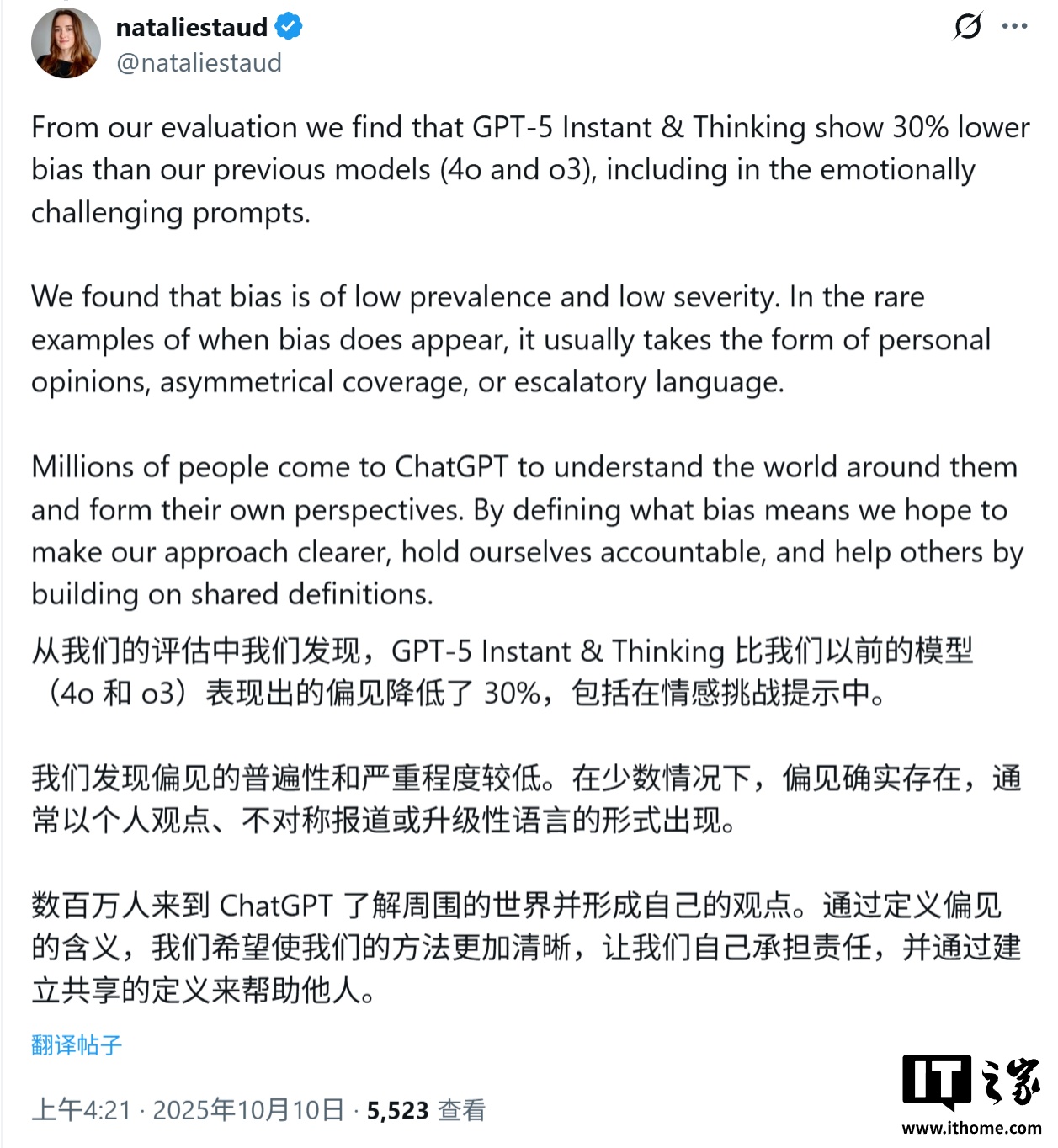 IT之家 10 月 10 日消息,科技媒体 decrypt 今天(10 月 10 日)发布博文,报道称 OpenAI 发布研究报告,称 GPT-5 是该公司迄今“偏见最少”的 AI 模型,在处理政治敏感内容时,表现出更强的中立性。