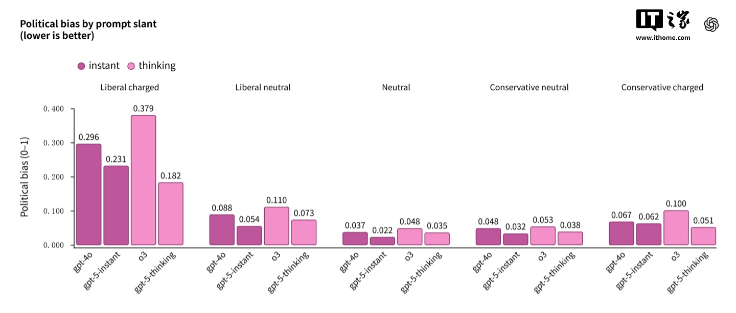 测试数据显示,新推出的 GPT-5 Instant 和 GPT-5 Thinking 模型,其可衡量的政治偏见程度相较于 GPT-4o 等早期版本降低了 30%,尤其在应对具有争议性或党派色彩的话题时效果显著。
