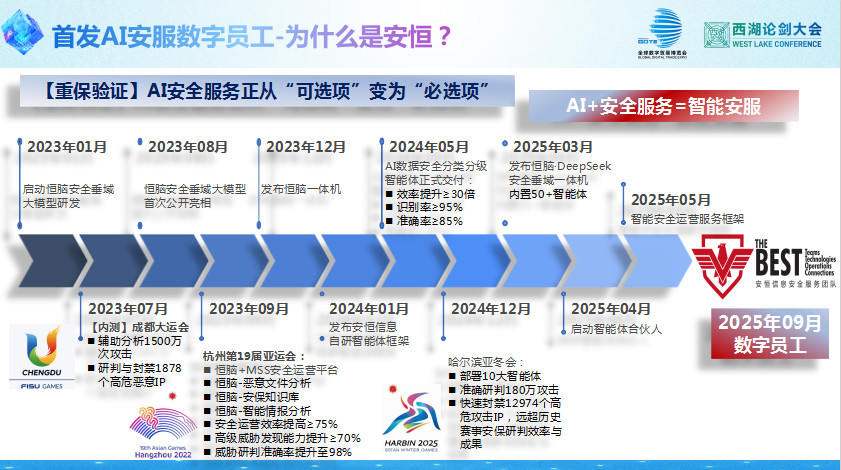 2023年起,安恒信息开始在成都大运会、杭州亚运会、哈尔滨亚冬会等重大赛事中用AI进行实战验证。尤其在今年初哈尔滨亚冬会的重保工作中,公司首次使用了10个安全智能体,为亚冬会筑牢网络安全防线,赛后便决定全面推广。