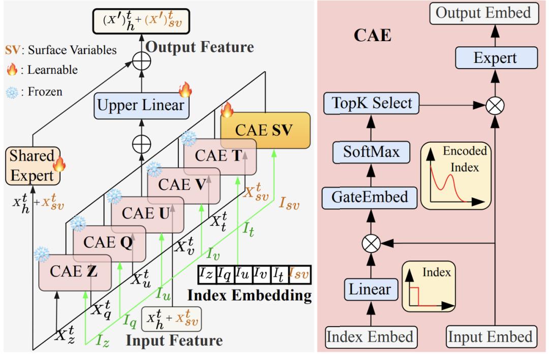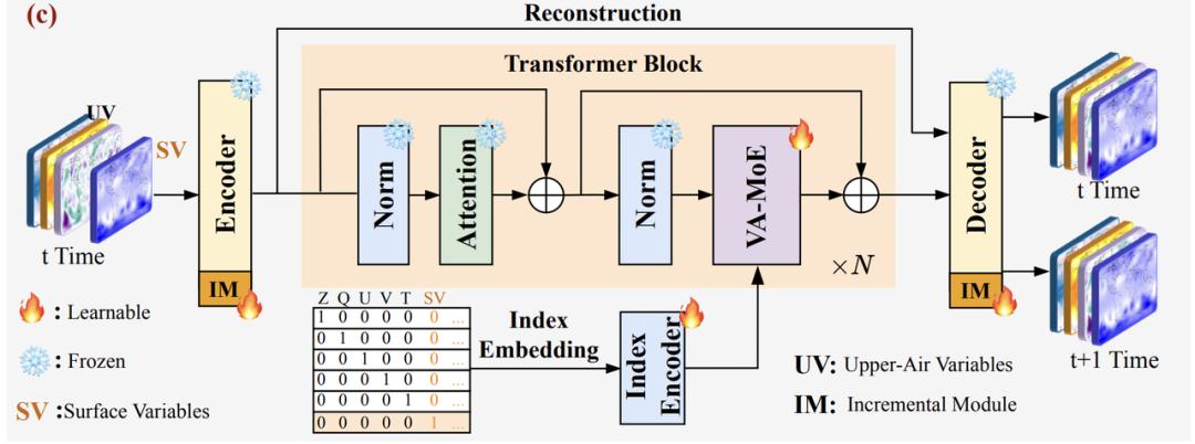 * 提出首个专为增量大气建模设计的框架 VA-MoE,通过变量索引嵌入驱动的上下文变量激活实现专家专业化