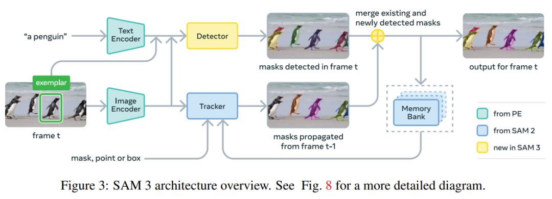 在模型架构上,SAM 3 采用双编码器 - 解码器 Transformer 架构,这是一个具有图像级识别能力的检测器 —— 通过与跟踪器和内存模块相结合,可应用于视频领域。检测器和跟踪器通过对齐的感知编码器(PE)主干网络接收视觉 - 语言输入。