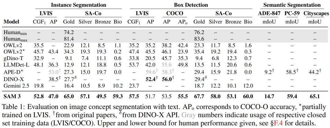 表 1 显示:在零样本设置下,SAM 3 在封闭词汇数据集 COCO、COCO-O 和 LVIS 的边界框检测任务中具有竞争力,在 LVIS 掩码任务上表现显著更好。