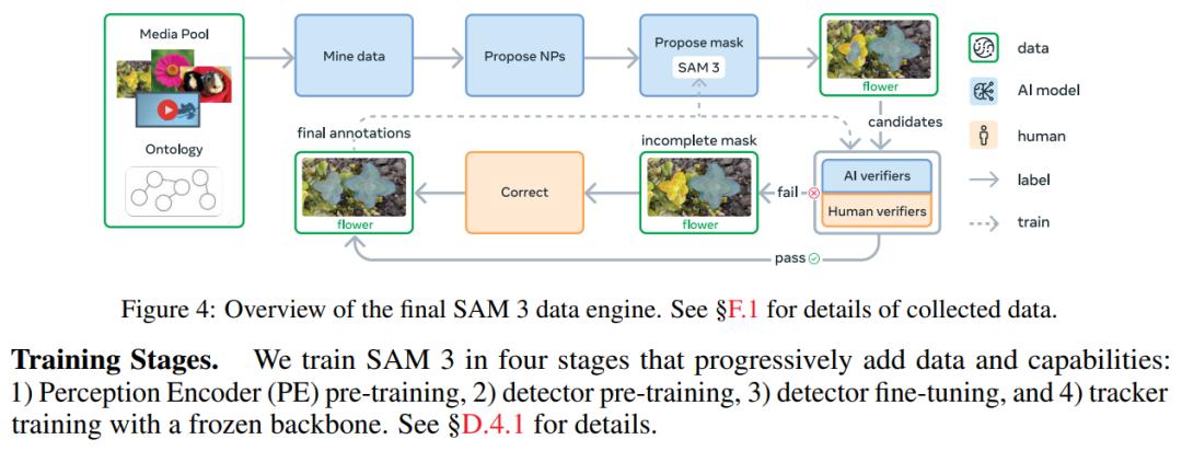 此外,该研究还构建了一个可扩展的人机协同数据引擎(如下图),用于为大规模多样化训练数据集进行标注。基于这套系统,该研究成功标注了包含 400 万独特短语和 5200 万掩码的高质量训练数据,以及包含 3800 万短语和 14 亿掩码的合成数据集。