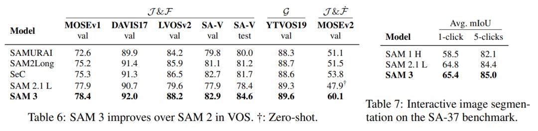 表 6 将 SAM 3 与 VOS(Video Object Segmentation) 任务上的先进方法进行了比较。SAM 3 在大多数基准测试中都比 SAM 2 取得了显著的改进。对于交互式图像分割任务,SAM 3 在平均 mIoU 方面优于 SAM 2。