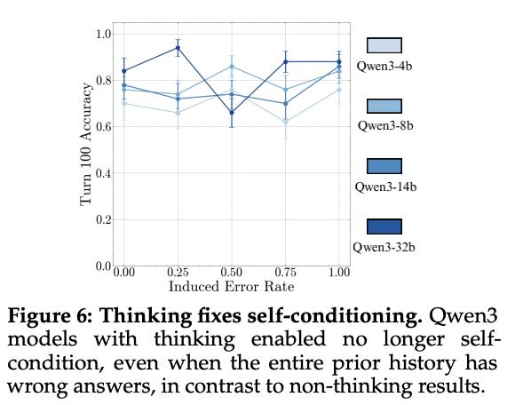 然而,即便这样,这些大模型仍然容易受到自条件化的影响,当其历史中的诱导错误率上升时,性能仍会持续退化。