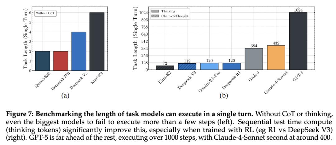 GPT-5 Thinking单轮可执行1000+步,Claude-4-Sonnet约432步。