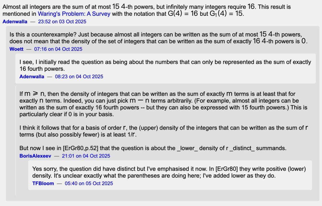 zach Hunter试图探索加法基在不同规模下的密度稳定性,Woett则提出了一些具体的集合构造,尝试作为可能否定命题的反例。双方围绕“互不相同元素(distinct)”“下密度(lower density)”以及“有界倍增(bounded doubling)”等概念展开推敲。