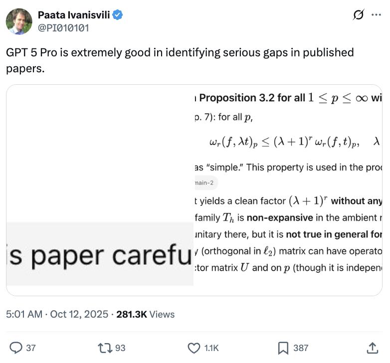 加州大学欧文分校数学教授Paata Ivanisvili也发推文表示,GPT-5Pro在识别已发表论文中的严重缺陷方面表现出色。