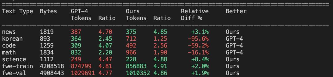 尽管如此,即使在词汇量较小的条件下,我们在FineWeb数据集上仍以微弱优势超越了GPT-4——因为这正是我们训练所用的数据集,所以我们的分词器能完美契合该文档分布(例如在英语文本压缩方面可能更具优势)。