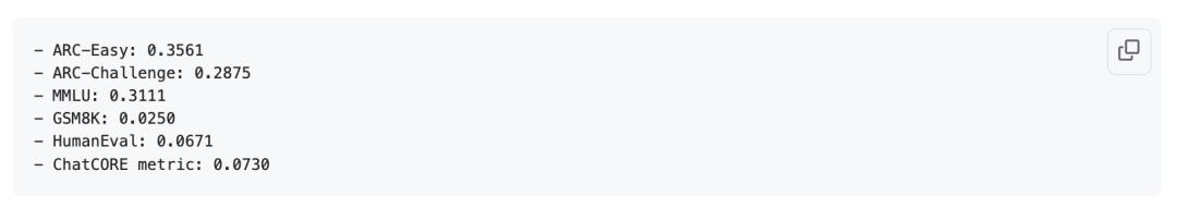 ChatCORE:这是卡帕西尝试复制CORE分数对基础模型的评估方式,并将其扩展到聊天模型的成果。也就是说,将上述所有指标都减去基准性能,这样分数就在0到1之间(例如,随机模型得0分,而不是MMLU上的25%),然后报告所有任务的平均值。它是对当前模型实力的一个单一数字总结。