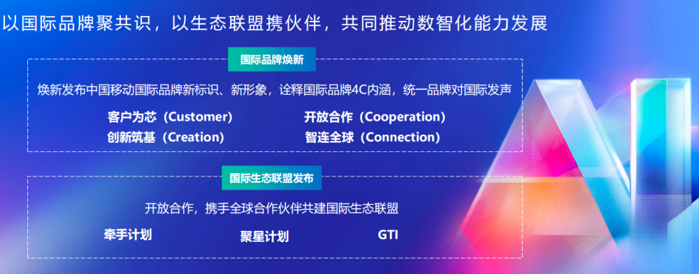 中国移动全球合作伙伴大会展示AI大模型等解决方案,投资规模超1900亿,成立多个生态联盟,发布国际品牌CMobile,拓展海外布局,提出“聚星计划”推动生态融合,助力中资企业全球市场发展。