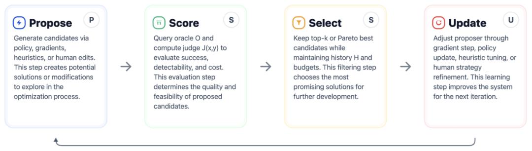 因此,研究者提出了一个通用的自适应攻击框架,它统一了许多针对 LLM 的成功提示词攻击背后的共同结构。一次攻击由一个优化循环组成,每次迭代可分为四个步骤:
