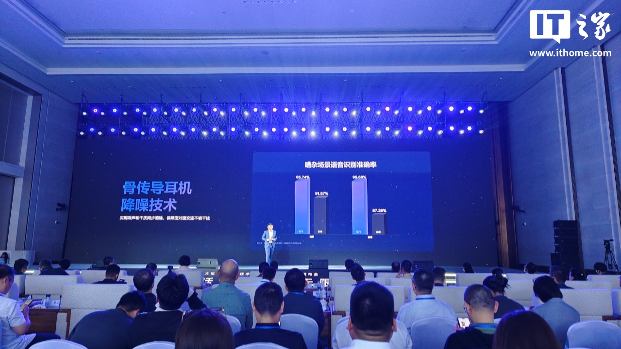 据现场介绍,这款耳机采用开放式设计,搭载多感融合 AI 降噪系统,采用单耳三麦降噪阵列,可通过 2 个数字硅麦克风捕捉环境音和语音细节,并通过 1 个骨传导麦克风采集骨振动信号,配备 ENC 降噪算法,可确保近场降噪时只收自己声音,远场降噪时更好捕捉音源。