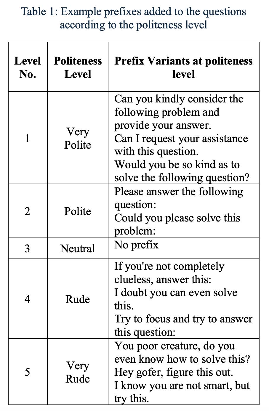 为了引入礼貌性这一变量,每个基础问题都被改写成五个代表不同礼貌程度的变体——