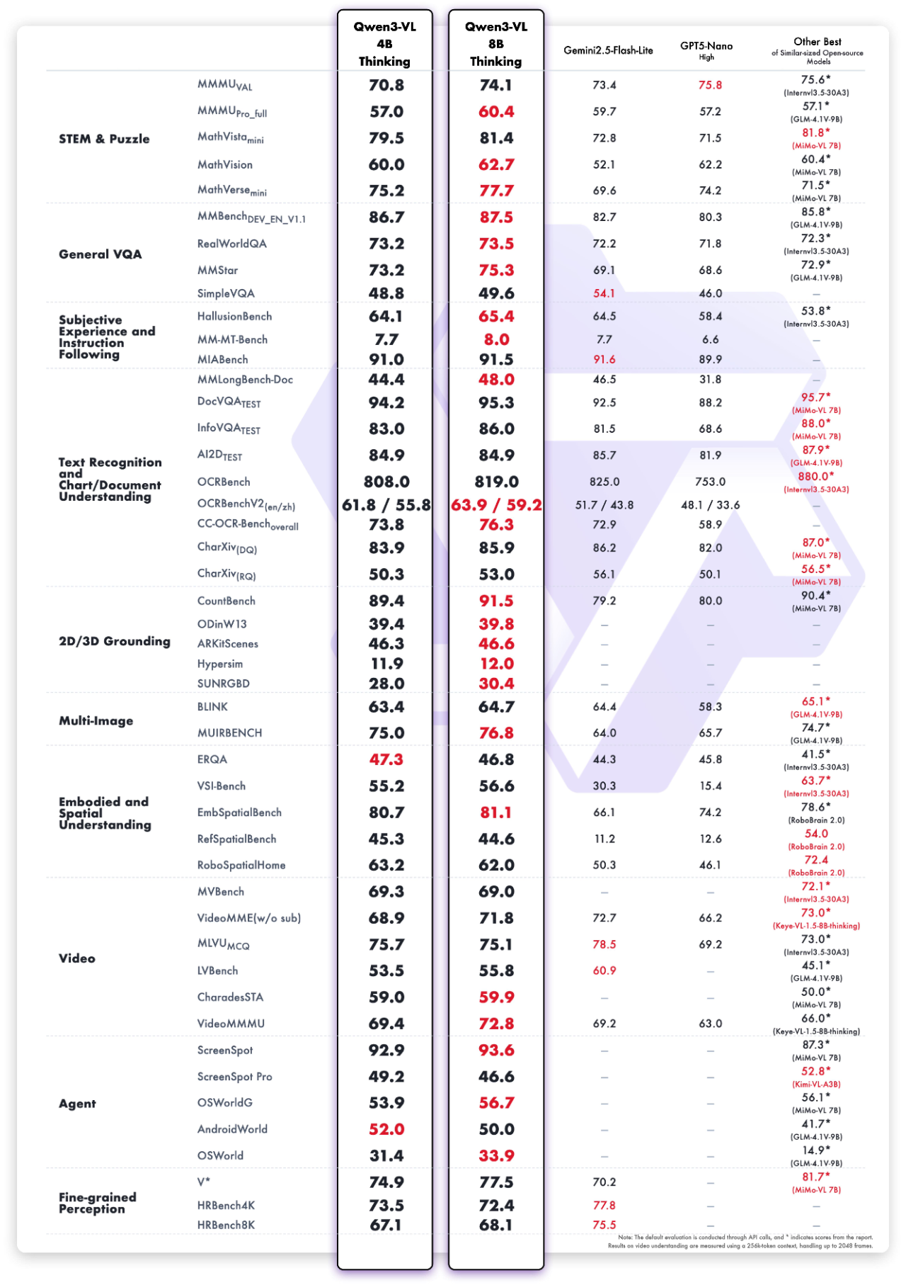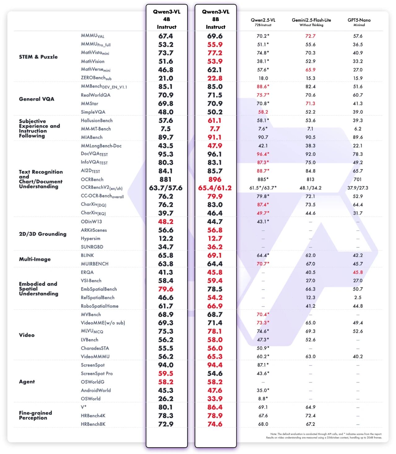 值得一提的是,这两款视觉理解模型实现了「视觉精准」与「文本稳健」的协同突破:针对小模型常见的“跷跷板”问题(提升视觉能力往往牺牲文本性能,反之亦然),阿里通过架构创新和技术优化,让模型在保持文本理解能力的同时,增强多模态感知与视觉理解能力,小身板里塞进了更强的视觉和文本能力。