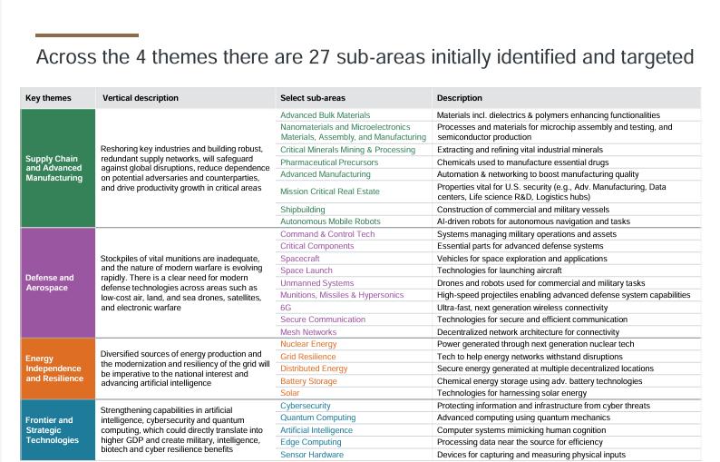计划拆解开看,覆盖的细分领域分了四类:供应链及先进制造、国防与航空航天、能源自主与韧性、前沿与战略技术,往下再细分成 27 个具体方向,造船、核能、纳米材料这些都在里面。