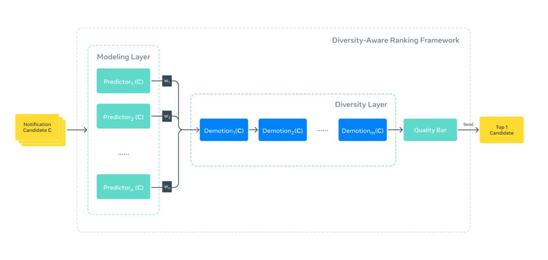 新系统作为一层“多样性过滤层”运行在现有的互动模型之上。它会从多个维度评估候选通知,包括内容类型、作者身份、通知类别以及所属产品区域(如 Feed、Reels 或 Stories)。对于那些与近期通知过于相似的候选项,系统会施加经过校准的“乘性惩罚”,降低其相关性评分。这种“惩罚系数”介于 0 到 1 之间,通过调整基础分数来降低重复通知的排名。工程师可以为不同维度配置权重,以微调“相关性”与“多样性”的平衡,让不同团队可根据自身产品需求灵活应用。