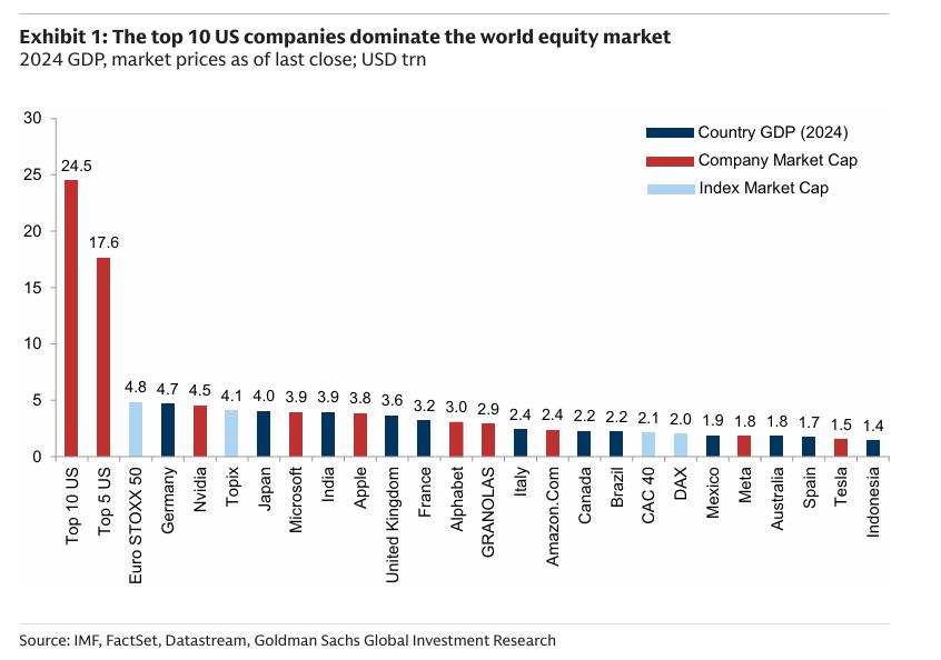根据高盛研报数据显示,美国最大的5家科技公司现在的总价值超过了欧洲斯托克50指数、英国、印度、日本和加拿大市场的总和,其价值约占全球公开股票市场总值的16%。