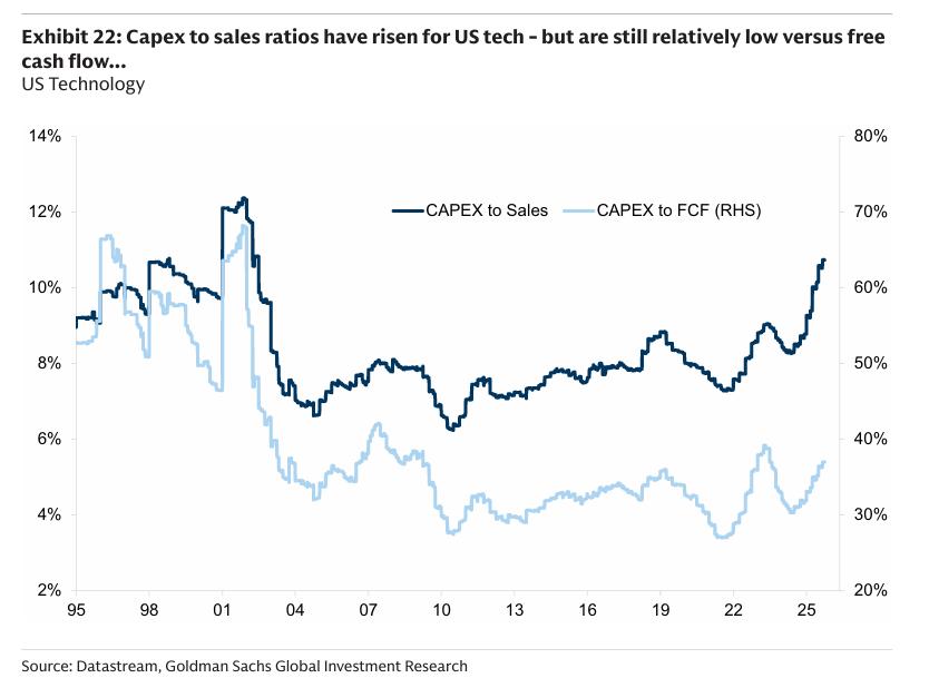 最后,同1990年代末不同的是,美国科技股的资本支出与销售额之比迅速攀升的同时,资本支出与自由现金流之比却一直保持稳定。