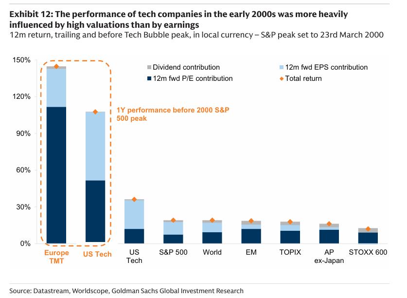 高盛通过将过去科技股的回报分解为盈利、估值和股利贡献后发现,2000年互联网泡沫峰值时,除了盈利之外,还有比我们今天所见的要大得多的估值上升。尤其是对于欧洲电信股来说,估值上升甚至更陡峭,回报几乎完全由估值而非盈利驱动。
