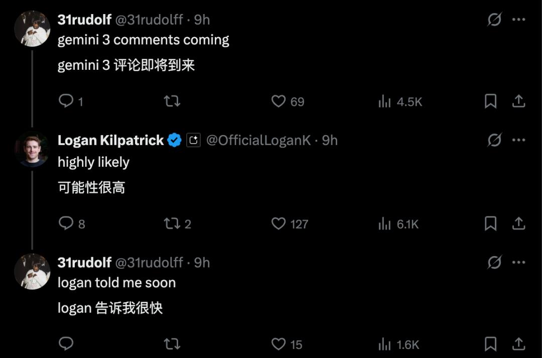 有网友直接问 AI studio 负责人,Gemini 3 是不是即将到来,Logan 回复他说「可能性很高」。