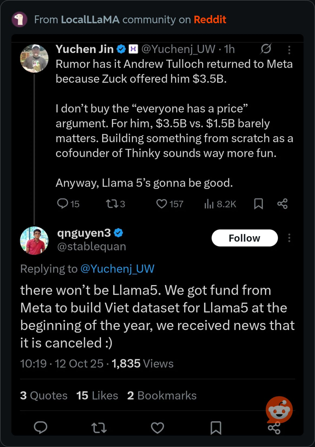 爆料人说是 Meta 的数据集供应方。不过后来他又删掉了这个回复,表示以上并非官方消息,他只是从另一个获得 Meta 资金的团队那里得到了这个消息。