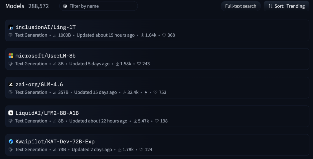 在趋势榜中,蚂蚁的 Ling-1T、智谱的 GLM-4.6,都是当下最受关注的开源模型。