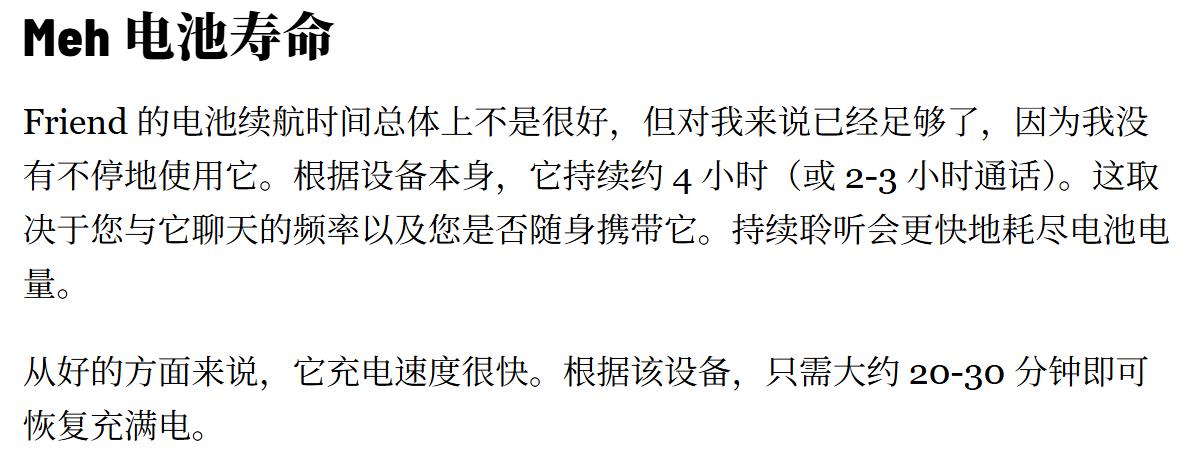 可惜错了呀,据外媒Good Housekeeping报道,虽然Friend号称电池续航15小时,但实际续航只有约4小时,并需频繁充电,根本没法使用,直接重蹈了第一波网红AI硬件的覆辙。