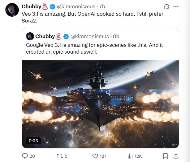 不过,AI领域创作者@kimmonismus则给予了"Veo 3.1令人惊艳"的评价,尽管他也认为OpenAI的最新模型在整体体验上仍略胜一筹。