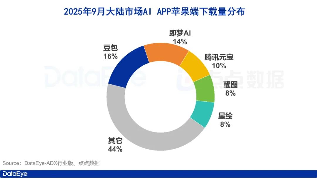 具体来看,TOP 5应用下载量较8月份下滑了11个百分点,豆包蝉联第一名,下载量占比由8月份的19%进一步下滑至16%,即梦AI和腾讯元宝分别由8月份的第三、四名,提升至9月份的第二、三名,星绘则由8月份的第二下滑至9月份的第五,另外,8月份位列第五的夸克跌出9月份TOP 5,取而代之的是字节旗下的醒图跻身9月份第四位,下载量占比8%。