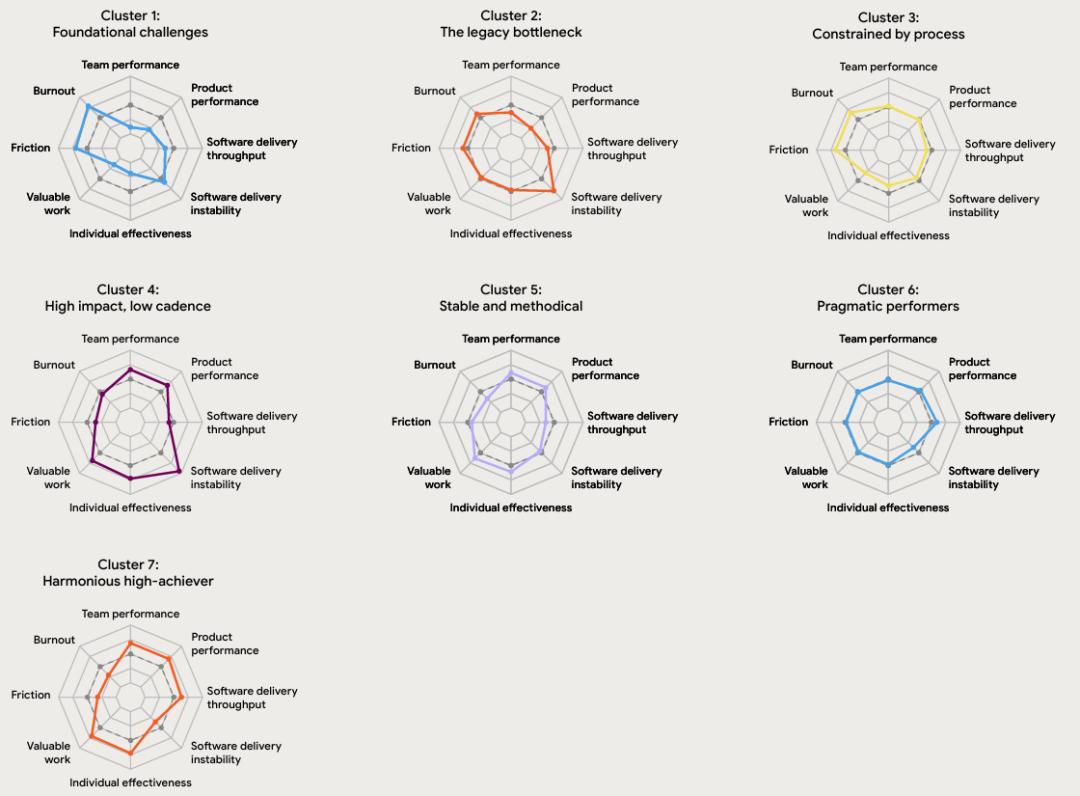 在今年的DORA报告里,研究者把近五千个团队的画像汇总成了七种「典型人设」。