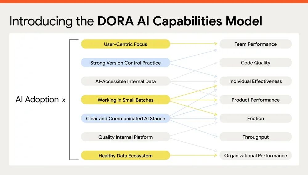 如果说「团队人设」像是一份诊断报告,告诉你你是谁,那么DORA提出的AI能力模型,就是一份行动指南,告诉你该怎么做。