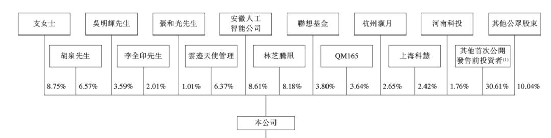 此外,沸点资本合计持股9.62%,系第一大外部股东;科大讯飞持股12.54%的安徽人工智能公司持股8.61%;林芝腾讯持股8.18%;启明创投旗下QM165持股3.64%,北京启明持股1.21%,合计持股约4.85%;联想基金持股3.80%;阿里旗下杭州灏月持股2.65%;早期个人投资者张和光持股1.01%。