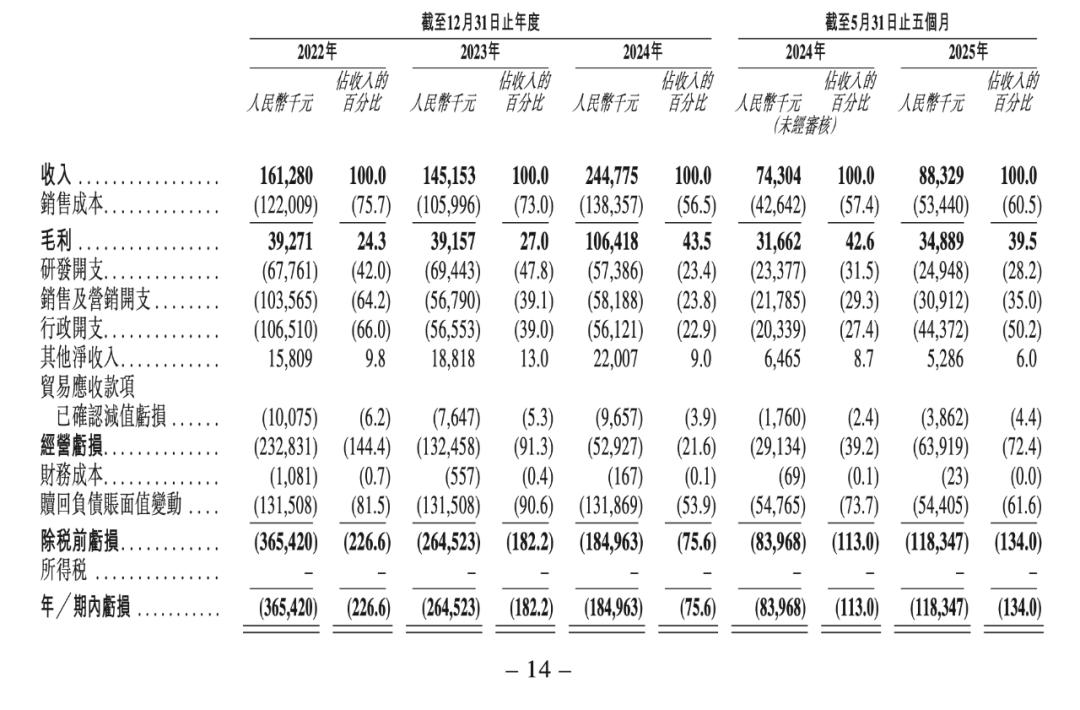 招股书显示,2022-2024年及今年前5个月(下称:报告期),云迹科技的研发开支分别为6776.1万、6944.3万、5738.6万、2494.8万元,分别占同年总收入的42.0%、47.8%、23.4%、28.2%。