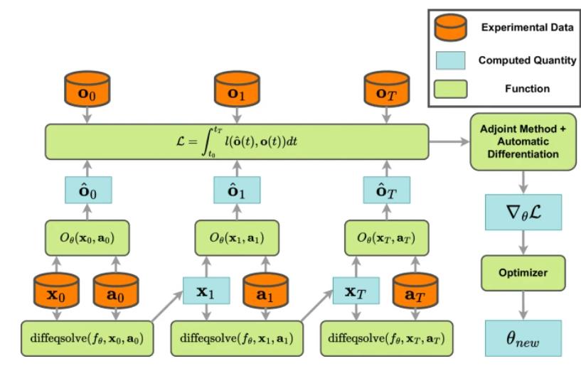 神经状态空间模型(NSSM)的训练过程,遵循一个高效且自动化的流程。模型由动力学函数 fθ 和观测函数 Oθ 定义,进行前向模拟生成预测数据,并与实验观测值对比计算损失。借助 diffrax 和 JAX 的自动微分伴随方法,从而优化模型参数。