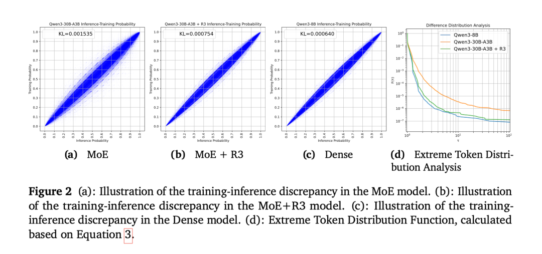 研究人员提出的 R3,其工作原理是在序列生成期间从推理引擎捕获路由分布,并将其直接重放到训练引擎中。这一过程可以缩小训练和推理之间的差距,其显著特征是不同引擎生成的逻辑向量的 KL 散度(量化两个概率分布之间的差异程度,值越小说明两个分布越接近)显著降低,两个阶段之间概率差异显著的 token 数量减少了大约一个数量级。
