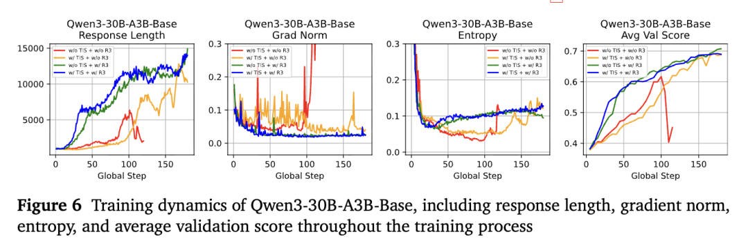 结果显示,R3 具有更小的梯度范数、更平滑的序列增长模式和更稳定的熵。实验中使用 R3 时,生成的序列长度在训练开始时迅速上升,表明 R3 能够快速捕捉到正确的优化方向,相比之下其他两个训练过程在第 80 步之后才缓慢上升,并且波动更为明显;R3 始终保持较低的梯度范数,表明优化过程更加稳定;实验使用 R3 时,熵在大约第 25 步后开始稳步上升,表明模型更早地开始探索更优策略,不使用 R3 时,熵上升得更晚,并且波动较大。