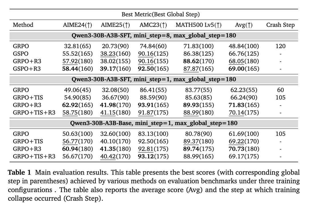 训练稳定性方面:如 GRPO、GRPO+TIS 等无 R3 的方法在单步更新场景中均出现崩盘,GRPO 在 60 步崩盘、GRPO+TIS 在 105 步崩盘。