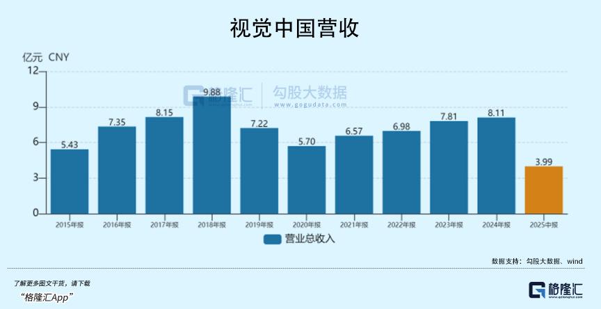 2025年上半年,视觉中国营收3.99亿元,同比微增0.05%,净利润同比下滑13.91%,仅约4377.9万元。