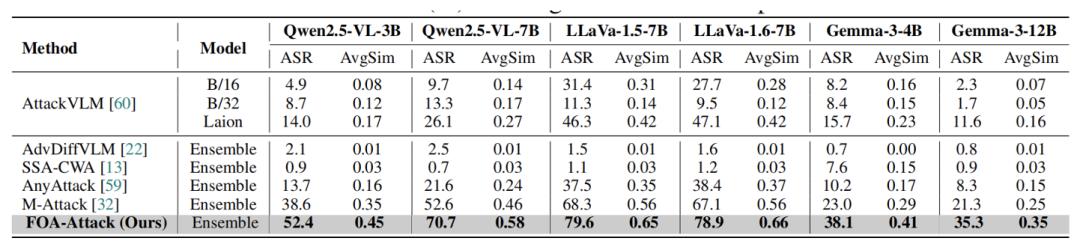 在 Qwen2.5-VL、LLaVA、Gemma 等开源模型上,FOA-Attack 的攻击成功率(ASR)和语义相似度(AvgSim)显著高于 M-Attack、AnyAttack 等方法。